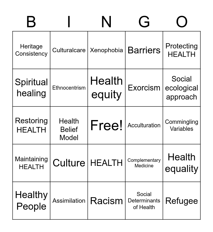 This bingo card has 1 images, a free space and 28 words: Healthy People, Health Belief Model, Sick role, Heritage Consistency, Xenophobia, Ethnocentrism, Culture, Acculturation, Assimilation, Commingling Variables, Refugee, Racism, Social Determinants of Health, Social ecological approach, health, HEALTH, Maintaining HEALTH, Protecting HEALTH, Restoring HEALTH, Complementary Medicine, Religion, Exorcism, Spiritual healing, Barriers, Culturalcare, Health equality, Health equity and Perceived benefits.