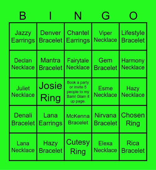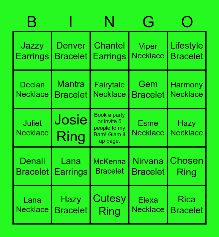 This bingo card has a free space and 24 words: Lana Earrings, Hazy Bracelet, Fairytale Necklace, Lana Necklace, Lifestyle Bracelet, Jazzy Earrings, Declan Necklace, Denver Bracelet, Esme Necklace, McKenna Bracelet, Gem Bracelet, Juliet Necklace, Nirvana Bracelet, Chosen Ring, Mantra Bracelet, Elexa Necklace, Hazy Necklace, Chantel Earrings, Harmony Necklace, Josie Ring, Rica Bracelet, Denali Bracelet, Viper Necklace and Cutesy Ring.
