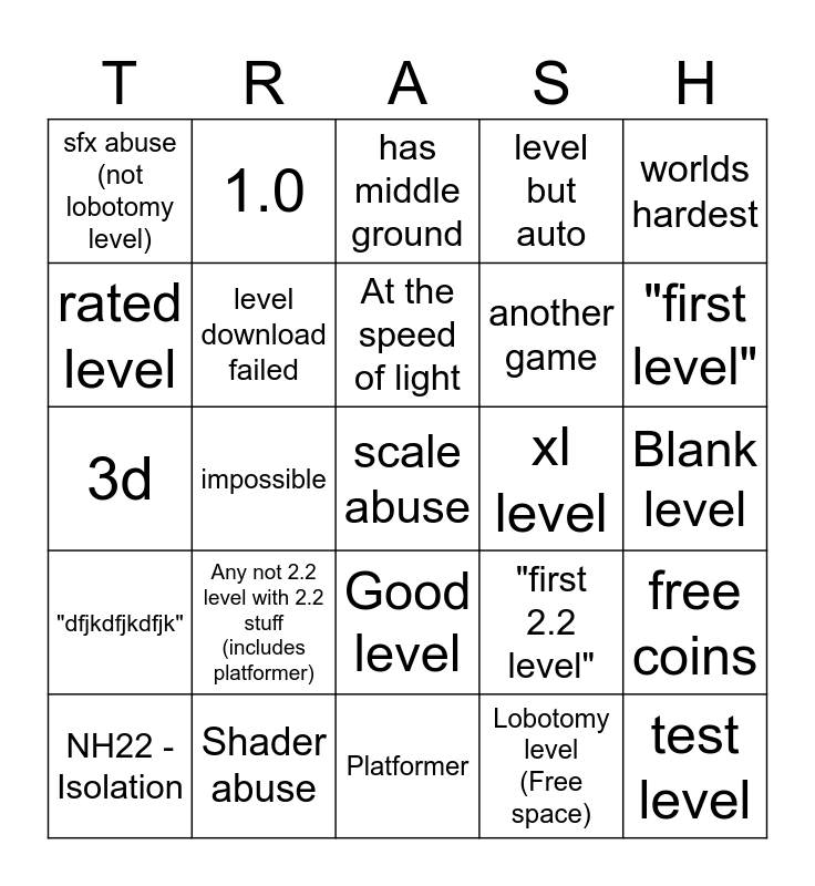 This bingo card has 30 words: Shader abuse, Bug showcase, impossible, New trigger abuse (not shaders or sfx), sfx abuse (not lobotomy level), has middle ground, level download failed, Good level, xl level, Platformer, Blank level, scale abuse, Lobotomy level (Free space), test level, "first level", "untitled 0", "first 2.2 level", "dfjkdfjkdfjk", Any not 2.2 level with 2.2 stuff (includes platformer), worlds hardest, 3d, Any level but copyable ver, 1.0, another game, rated level, level but auto, free coins, NH22 - Isolation, At the speed of light and retray.