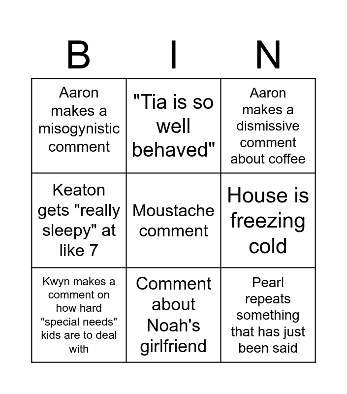This bingo card has a free space and 8 words: House is freezing cold, Aaron makes a dismissive comment about coffee, "Tia is so well behaved", Kwyn makes a comment on how hard "special needs" kids are to deal with, Aaron makes a misogynistic comment, Pearl repeats something that has just been said, Keaton gets "really sleepy" at like 7 and Comment about Noah's girlfriend.