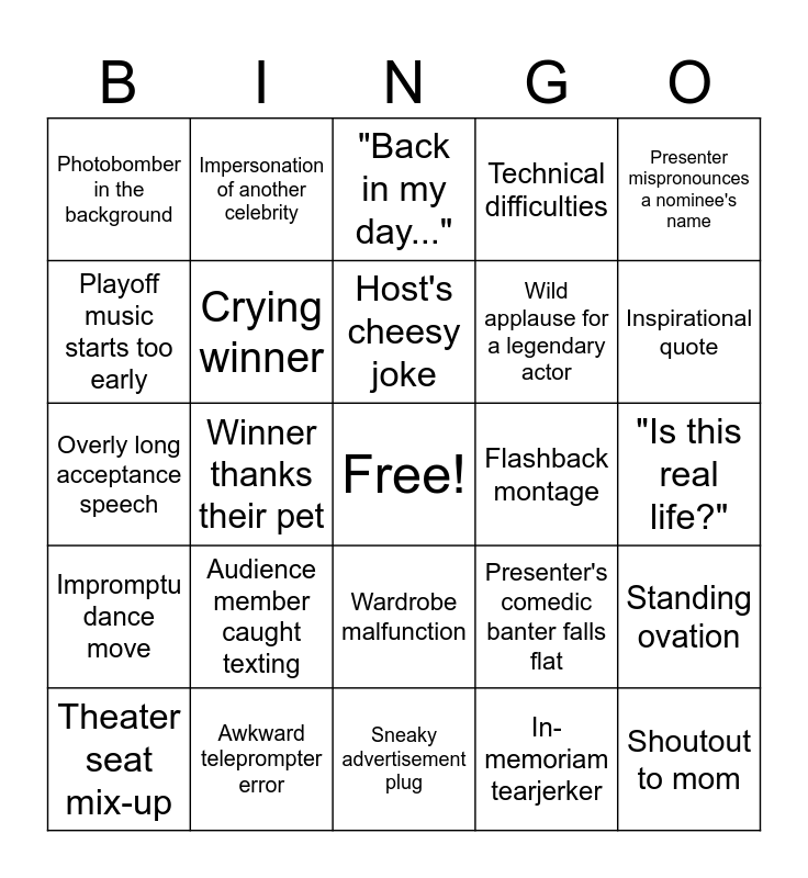 This bingo card has a free space and 40 words: Unexpected trip on the red carpet, Overly long acceptance speech, Mention of "I didn't prepare a speech", Crying winner, Awkward teleprompter error, Wardrobe malfunction, Host's cheesy joke, Unplanned musical number, Presenter mispronounces a nominee's name, Impromptu dance move, Winner thanks their pet, Technical difficulties, Shoutout to mom, "Is this real life?", Flashback montage, Audience member caught texting, Surprise celebrity appearance, Photobomber in the background, Trendy fashion statement, "Back in my day...", Standing ovation, In-memoriam tearjerker, Wild applause for a legendary actor, Playoff music starts too early, Speech interrupted by music, Unscripted political statement, Awkward kiss on stage, Winner forgets their award on stage, Presenter makes a flub, Excessive use of the word "incredible", Camera catches a celebrity yawning, Theater seat mix-up, Lost envelope, Presenter's comedic banter falls flat, Inspirational quote, Sneaky advertisement plug, Unplanned duet, Audience sing-along, Impersonation of another celebrity and "Sorry, I'm so nervous!".