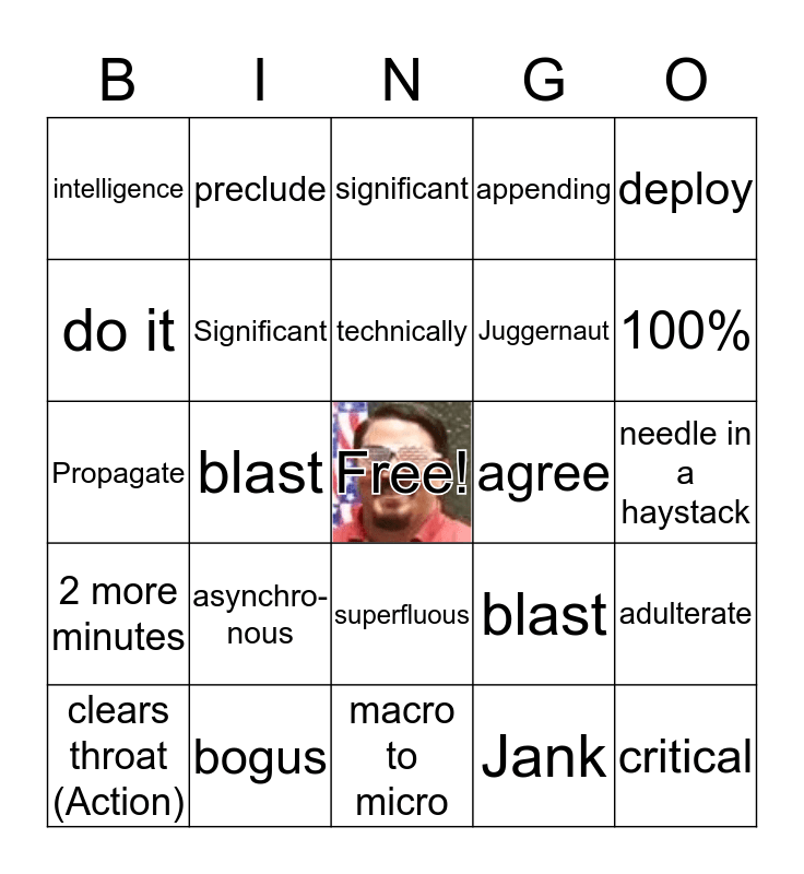This bingo card has a free space and 24 words: asynchro- nous, bogus, technically, clears throat (Action), deploy, intelligence, do it, preclude, agree, superfluous, Juggernaut, Propagate, blast, adulterate, Significant, Jank, needle in a haystack, significant, 100%, blast, critical, 2 more minutes, appending and macro to micro.