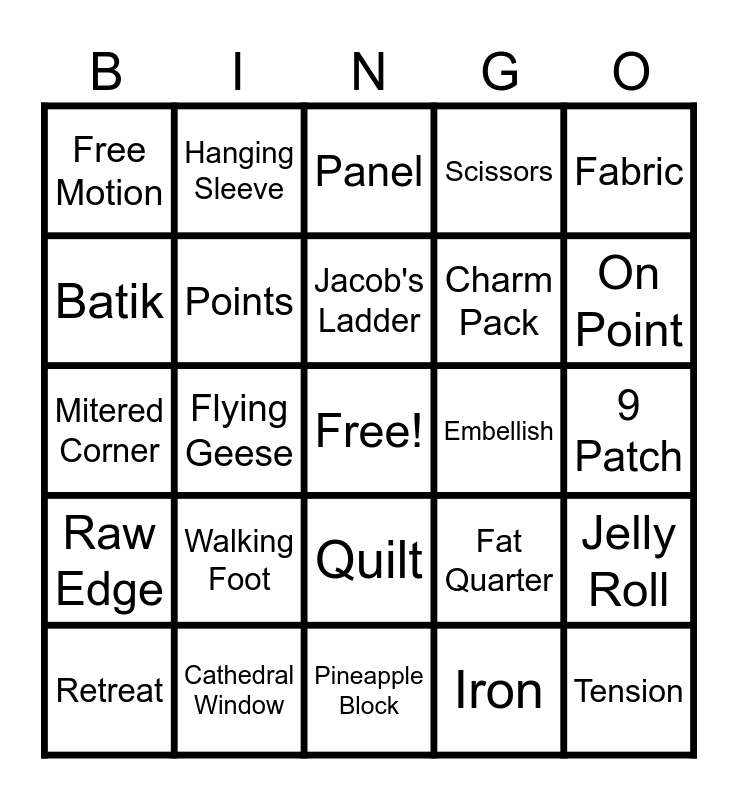 This bingo card has a free space and 100 words: 1/2 Square Triangle, 1/4 Inch Foot, 9 Patch, Applique, Backing, Bargello, Basting, Bias, Binding, Bobbin, Bobbin Case, Bobbin Winder, Border, Cathedral Window, Chain Piecing, Color Wheel, Charm Pack, Contrast, Corner Stone, Crazy Quilt, Cutting Mat, Design Wall, Dog Ears, Dresden, Echo Quilting, Embellish, Fabric, Fat Quarter, Feed Dogs, Flannel, Flying Geese, Free Motion, Friendship Star, Fussy Cut, Iron, Jacob's Ladder, Jelly Roll, Label, Layer Cake, Log Cabin, Lone Star, Longarm, Mitered Corner, Needle, On Point, Panel, Panto, Paper Piecing, Pin Wheel, Pineapple Block, Pins, Pressing Mat, Quilt Block, Quilt Sandwich, Quilting Cotton, Rag Quilt, Rail Fence, Rotary Cutter, Sashing, Scissors, Scraps, Seam Allowance, Selvedge, Serger, Sewing Machine, Shop Hop, Stiletto, Stitch Ripper, Template, Ruler, Thread, Walking Foot, Wonder Clips, Pattern, UFO, Width of Fabric, Stitch Length, Batik, Stitch In The Ditch, Quilt Guild, Quilt of Valor, Tension, Strip Poker, Quilt, Fusible, Hanging Sleeve, Hexies, Irish Chain, Mystery Quilt, Raw Edge, Quilt as You Go, Strip Set, Stash, Retreat, Points, Nesting Seams, Top Stitch, Class, Tape Measure and Seam Guide.