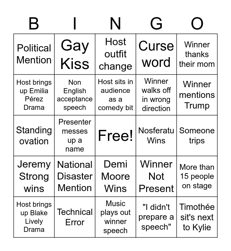 This bingo card has a free space and 24 words: Host brings up Blake Lively Drama, National Disaster Mention, Host sits in audience as a comedy bit, "I didn't prepare a speech", Winner thanks their mom, Political Mention, Gay Kiss, Host outfit change, Nosferatu Wins, Someone trips, Standing ovation, Non English acceptance speech, Winner Not Present, More than 15 people on stage, Host brings up Emilia Pérez Drama, Technical Error, Music plays out winner speech, Curse word, Winner mentions Trump, Jeremy Strong wins, Presenter messes up a name, Demi Moore Wins, Winner walks off in wrong direction and Timothée sit's next to Kylie.