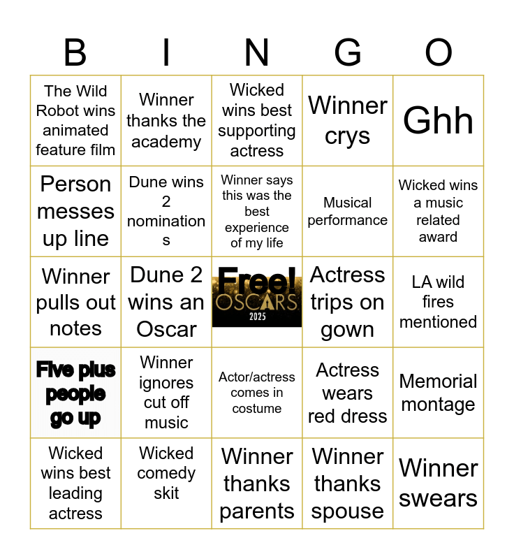 This bingo card has a free space and 29 words: Wicked wins best leading actress, Moana 2 wins an Oscar, Dune 2 wins an Oscar, Speech gets cut short, The Wild Robot wins animated feature film, Wicked wins best supporting actress, Dune wins 2 nomination s, Winner ignores cut off music, Actress trips on gown, Wicked comedy skit, LA wild fires mentioned, Winner swears, Winner thanks parents, Winner thanks spouse, Wicked wins a music related award, Wardrobe malfunction, Actor/actress comes in costume, Five plus people go up, Ghh, Winner pulls out notes, Actress wears red dress, Person wears bowtie, Musical performance, Person messes up line, Winner crys, Winner thanks the academy, Memorial montage, Winner says this was the best experience of my life and Winner thanks actor/actress.
