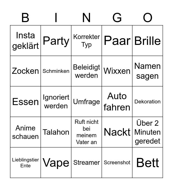 This bingo card has a free space and 24 words: Talahon, Vape, Beleidigt werden, Lieblingstier Ente, Brille, Insta geklärt, Zocken, Party, Auto fahren, Ruft nicht bei meinem Vater an, Wixxen, Essen, Nackt, Über 2 Minuten geredet, Schminken, Screenshot, Dekoration, Korrekter Typ, Namen sagen, Ignoriert werden, Bett, Anime schauen, Paar and Streamer.
