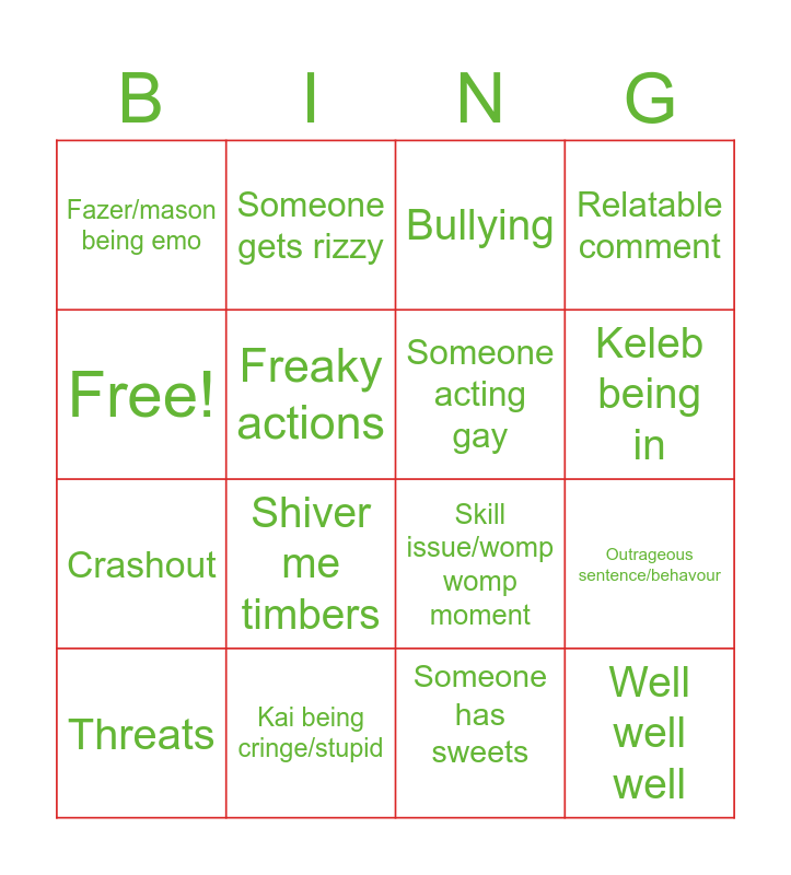This bingo card has 16 words: Kai being cringe/stupid, Outrageous sentence/behavour, Bullying, Fazer/mason being emo, Crashout, Someone gets rizzy, Skill issue/womp womp moment, Someone has sweets, Free!, Freaky actions, Threats, Relatable comment, Shiver me timbers, Keleb being in, Someone acting gay and Well well well.