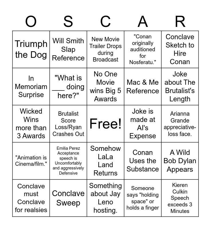 This bingo card has a free space and 24 words: Emilia Perez Acceptance speech is Uncomfortably and aggressively Defensive, Conclave Sweep, No One Movie wins Big 5 Awards, Conclave must Conclave for realsies, Conclave Sketch to Hire Conan, Triumph the Dog, In Memoriam Surprise, Will Smith Slap Reference, Joke is made at AI's Expense, Somehow LaLa Land Returns, Mac & Me Reference, Wicked Wins more than 3 Awards, Conan Uses the Substance, A Wild Bob Dylan Appears, "What is ___ doing here?", Someone says "holding space" or holds a finger, Arianna Grande appreciative-loss face., New Movie Trailer Drops during Broadcast, Joke about The Brutalist's Length, Brutalist Score Loss/Ryan Crashes Out, Kieren Culkin Speech exceeds 3 Minutes, "Animation is Cinema/film.", "Conan originally auditioned for Nosferatu." and Something about Jay Leno hosting..
