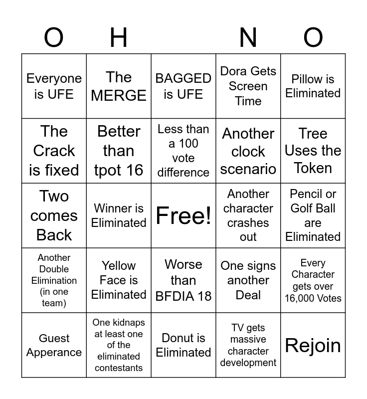 This bingo card has a free space and 24 words: Yellow Face is Eliminated, One kidnaps at least one of the eliminated contestants, Less than a 100 vote difference, Guest Apperance, Pillow is Eliminated, Everyone is UFE, The Crack is fixed, The MERGE, Another character crashes out, Worse than BFDIA 18, Another clock scenario, Two comes Back, One signs another Deal, Every Character gets over 16,000 Votes, Better than tpot 16, TV gets massive character development, Pencil or Golf Ball are Eliminated, BAGGED is UFE, Tree Uses the Token, Winner is Eliminated, Rejoin, Another Double Elimination (in one team), Dora Gets Screen Time and Donut is Eliminated.