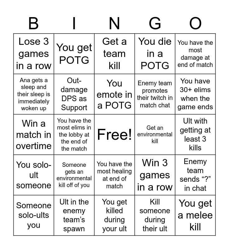 This bingo card has a free space and 24 words: Someone gets an environmental kill off of you, Ult in the enemy team’s spawn, You emote in a POTG, Someone solo-ults you, You have the most damage at end of match, Lose 3 games in a row, Ana gets a sleep and their sleep is immediately woken up, You get POTG, Get an environmental kill, You have the most healing at end of match, Enemy team promotes their twitch in match chat, Win a match in overtime, Win 3 games in a row, Enemy team sends “?” in chat, Out-damage DPS as Support, Kill someone during their ult, Ult with getting at least 3 kills, Get a team kill, You have 30+ elims when the game ends, You have the most elims in the lobby at the end of the match, You get a melee kill, You solo-ult someone, You die in a POTG and You get killed during your ult.