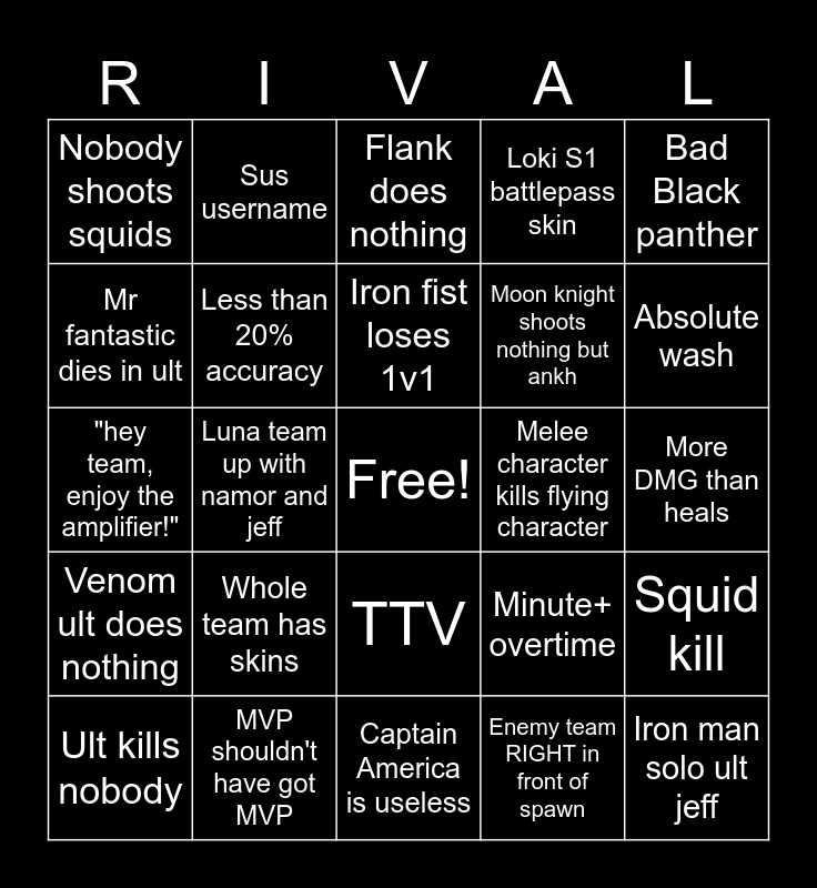 This bingo card has a free space and 94 words: 3 dps, Rocket less than 1k Dmg, 2 melee, Whole team no skins, Multiple flying characters, Lord spidey, Double support ult, TTV, Default spray in spawn, Lord, Aura walk, Cancelled ult, One useless teamate, More DMG than heals, C9, Sus username, Flank does nothing, Solo ult, Fell off the map, Jarvis, get freaky, Again 2x, Weird reticle, Enemy team RIGHT in front of spawn, Melee character keeps hitting air, Ult kills nobody, Less than 20% accuracy, 6 man ult, Melee character kills flying character, All of the fantastic 4, 1v6, MVP shouldn't have got MVP, Captain America is useless, support diff, Punisher doesn't react to melee character while on tureet, Mr fantastic dies in ult, Dies right after ult, Dies as ult is used, Ult after fight ends, Absolute wash, Jeff 4k+, Luna team up with namor and jeff, Iron fist loses 1v1, Moon knight shoots nothing but ankh, Cloak and dagger less than 85% accuracy, Venom ult does nothing, Lord gets diffed by some without lord (same character), No lords, Spidey sucks, 0-10, Nobody shoots peni dispenser, Nobody shoots Loki clones, Venom survives Wanda ult, Minute+ overtime, "spider bots? I prefer Herbie myself.", Portal flank, Portal ult, Portal off map, Portal off map kills teamate, Triple support, Insta lock DPS does bad and doesn't switch, Whole team has skins, Ranked skin invisible woman, Lord goes negative, Negative, Zero deaths, Zero kills for 1+ minute, Leaves in the first minute, Keeps switching, Bad Black panther, Tank diff, Dps diff, Support ults for no reason, Wolverine grabs someone off the map, Wanda mvp, "hey team, enjoy the amplifier!", Thing ult does nothing, 4+ ults (both teams count), Loki S1 battlepass skin, Iron man solo ult jeff, Curbstomp, Emote, Invis woman, magik and dagger on same team, Venom team up with spider and peni, Squid kill, Nobody shoots squids, Squirrel girl shoots randomly and gets kills, Fortnite groot, Jeff mvp, Jeff, Black widow, Hawkeye, Squirrel girl mvp, Free skin and Recolor skin (not free).