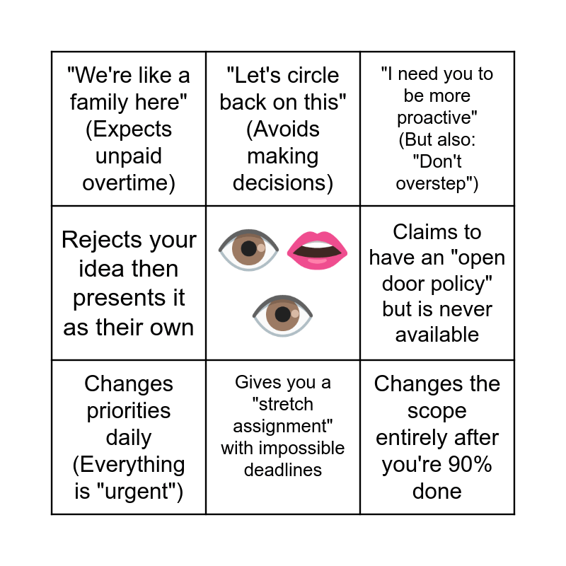 This bingo card has a free space and 8 words: Claims to have an "open door policy" but is never available, "I need you to be more proactive" (But also: "Don't overstep"), "Let's circle back on this" (Avoids making decisions), Changes priorities daily (Everything is "urgent"), "We're like a family here" (Expects unpaid overtime), Changes the scope entirely after you're 90% done, Rejects your idea then presents it as their own and Gives you a "stretch assignment" with impossible deadlines.