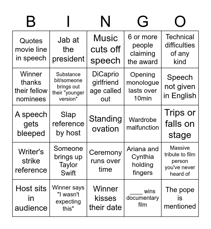 This bingo card has a free space and 24 words: Someone brings up Taylor Swift, Winner says "I wasn't expecting this", DiCaprio girlfriend age called out, Host sits in audience, Technical difficulties of any kind, Quotes movie line in speech, Winner thanks their fellow nominees, Jab at the president, Wardrobe malfunction, Ceremony runs over time, Opening monologue lasts over 10min, A speech gets bleeped, Ariana and Cynthia holding fingers, Massive tribute to film person you've never heard of, Substance bit/someone brings out their "younger version", ____ wins documentary film, Trips or falls on stage, Music cuts off speech, Speech not given in English, Slap reference by host, The pope is mentioned, Writer's strike reference, 6 or more people claiming the award and Winner kisses their date.