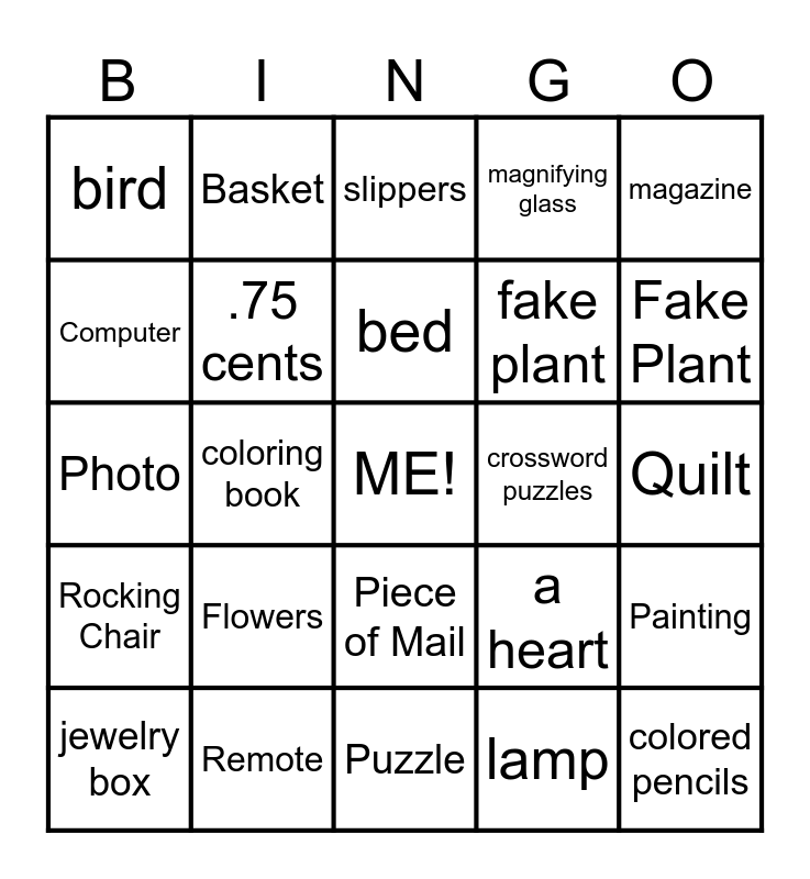 This bingo card has a free space and 55 words: Toothbrush, jewelry box, tree, bird, Puzzle, batteries, .75 cents, potted plant, fake plant, Greeting Card, magnifying glass, glasses, phone, radio, image of a bird, image of a butterfly, magazine, coloring book, markers, colored pencils, crossword puzzles, cell phone, a heart, slippers, candy, bed, lamp, TV, Quilt, Painting, Scissors, Pillow, Bird feeder, Novel, Computer, Photo, Tweezers, Rocking Chair, Cross, Packet of Pepper, Basket, Stuffed Animal, A Child’s Artwork, Curtains, Flowers, Remote, Coffee Cup, Pen, Crackers, Fake Plant, Braided Palm Frond, Doily, Figurine, Piece of Mail and Notepad.