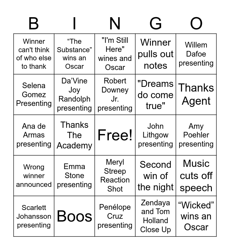 This bingo card has a free space and 81 words: "Nosferatu" wines an Oscar, "Nickel Boys" wines an Oscar, "I'm Still Here" wines and Oscar, "Sing Sing" wins an Oscar, "A Real Pain" wins an Oscar, Someone mentions Meryl Streep, Wardrobe Malfunction, Winner trips, Ben Stiller presenting, Winner is a film you've seen, Winner tears up, Kiss on camera, Winner pulls out notes, Winner can't think of who else to thank, Technical Difficulty, Selena Gomez Presenting, Conan O’Brien wears a costume, Emma Stone presenting, Previous Oscar winner, Amy Poehler presenting, June Squibb presenting, Willem Dafoe presenting, Ana de Armas presenting, Robert Downey Jr. presenting, Da’Vine Joy Randolph presenting, “A Complete Unknown” wins an Oscar, “Emilia Pérez”wins an Oscar, Cillian Murphy presenting, Joe Alwyn presenting, Elle Fanning presenting, Thanks Agent, Halle Berry presenting, Penélope Cruz presenting, Whoopi Goldberg presenting, Scarlett Johansson presenting, John Lithgow presenting, “The Brutalist” wins an Oscar, “Dune: Part Two” wins an Oscar, Bowen Yang presenting, Music cuts off speech, “Wicked” wins an Oscar, Talks to kids watching at home, Standing Ovation, Thanks Netflix, Thanks The Academy, Lily-Rose Depp presenting, “The Substance” wins an Oscar, “Anora” wins an Oscar, Sterling K. Brown presenting, First-time Oscar winner, Second win of the night, Music cuts off speech, “Conclave” wins an Oscar, Connie Nielsen presenting, Thanks Apple, Thanks Universal, Goldie Hawn presenting, Political Speech, Winner didn't attend awards, Will Smith Joke, Meryl Streep Reaction Shot, Winner wears sunglasses on stage, Censored Profanity, Conan O'Brian sits in audience as a bit, Dune popcorn bucket mention, "Holding Space" joke, Megalopolis Mentioned, "Brutalist" Length Joke, "I didn't prepare a speech", Presenter messes up a name, Interrupted by music, Wrong winner announced, Boos, Elon Musk Joke, Loser looks upset, Taylor Swift in audience dancing, Drunk during speech, Zendaya and Tom Holland Close Up, Coppola reference, "Dreams do come true" and Thanks A24.