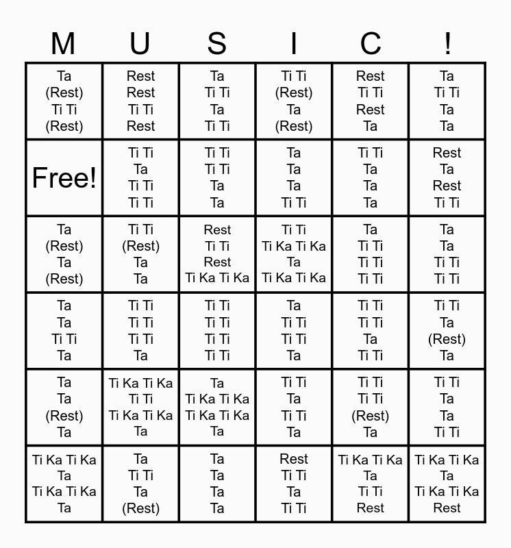 This bingo card has 36 words: Ta Ta Ti Ti Ta, Ti Ti Ti Ti Ti Ti Ta, Ta Ta Ta Ta, Ta Ta Ta Ti Ti, Ta Ti Ti Ti Ti Ti Ti, Ta Ta Ti Ti Ti Ti, Ta (Rest) Ti Ti (Rest), Ta Ti Ti Ta (Rest), Ta Ti Ti Ta Ti Ti, Ti Ti Ta Ti Ti Ta, Ti Ti Ta Ta Ta, Ta Ti Ti Ta Ta, Ta Ta (Rest) Ta, Ti Ti (Rest) Ta Ta, Ti Ti Ti Ti Ta Ta, Ti Ti (Rest) Ta (Rest), Ti Ti Ti Ti (Rest) Ta, Ti Ti Ta (Rest) Ta, Free!, Ti Ti Ta Ti Ti Ti Ti, Ti Ti Ti Ti Ti Ti Ti Ti, Ta Ti Ti Ti Ti Ta, Ti Ti Ti Ti Ta Ti Ti, Ti Ti Ta Ta Ti Ti, Ta (Rest) Ta (Rest), Rest Rest Ti Ti Rest, Rest Ti Ti Rest Ti Ka Ti Ka, Rest Ti Ti Ta Ti Ti, Rest Ti Ti Rest Ta, Rest Ta Rest Ti Ti, Ti Ka Ti Ka Ta Ti Ka Ti Ka Ta, Ti Ka Ti Ka Ti Ti Ti Ka Ti Ka Ta, Ta Ti Ka Ti Ka Ti Ka Ti Ka Ta, Ti Ti Ti Ka Ti Ka Ta Ti Ka Ti Ka, Ti Ka Ti Ka Ta Ti Ti Rest and Ti Ka Ti Ka Ta Ti Ka Ti Ka Rest.