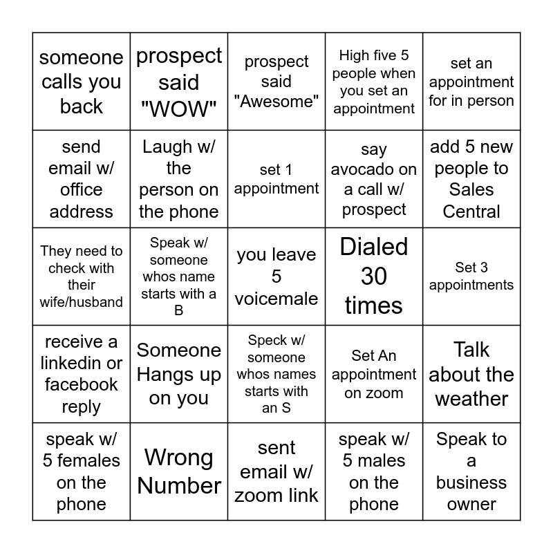 This bingo card has a free space and 24 words: Someone Hangs up on you, Wrong Number, set 1 appointment, speak w/ 5 females on the phone, set an appointment for in person, someone calls you back, send email w/ office address, prospect said "WOW", Dialed 30 times, Speck w/ someone whos names starts with an S, say avocado on a call w/ prospect, They need to check with their wife/husband, Set An appointment on zoom, Talk about the weather, Laugh w/ the person on the phone, speak w/ 5 males on the phone, Set 3 appointments, prospect said "Awesome", add 5 new people to Sales Central, Speak w/ someone whos name starts with a B, Speak to a business owner, receive a linkedin or facebook reply, High five 5 people when you set an appointment and sent email w/ zoom link.