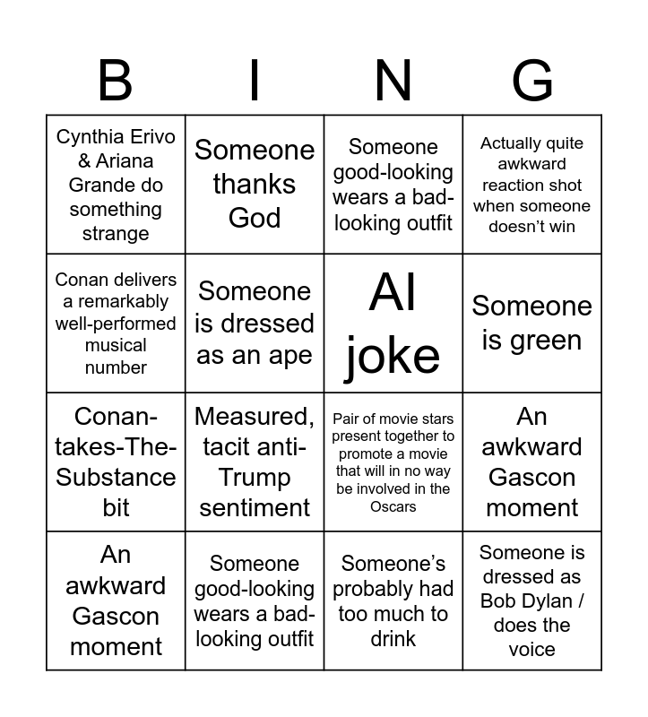 This bingo card has 20 words: An awkward Gascon moment, Conan delivers a remarkably well-performed musical number, Someone good-looking wears a bad-looking outfit, Cynthia Erivo & Ariana Grande do something strange, An awkward Gascon moment, Conan delivers a remarkably well-performed musical number, Someone good-looking wears a bad-looking outfit, Cynthia Erivo & Ariana Grande do something strange, Conan-takes-The-Substance bit, Someone thanks God, Measured, tacit anti-Trump sentiment, Pair of movie stars present together to promote a movie that will in no way be involved in the Oscars, Someone is dressed as an ape, Someone is dressed as Bob Dylan / does the voice, AI joke, Paul Rudd, Someone is green, Actually quite awkward reaction shot when someone doesn’t win, Someone’s probably had too much to drink and The audience is awkward during an earnest musical number.