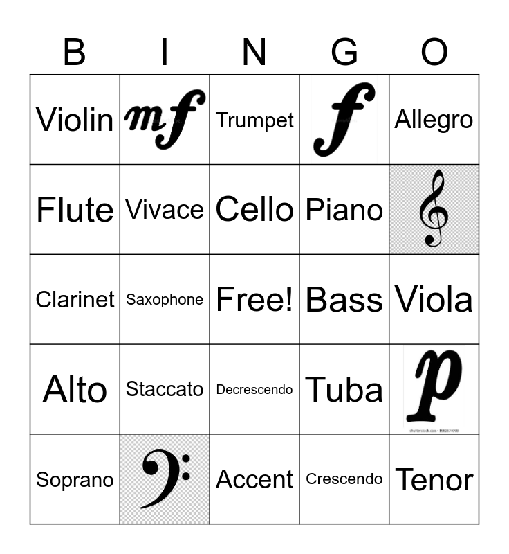This bingo card has 6 images, a free space and 23 words: Soprano, Marcato, Saxophone, Tenuto, Violin, Trumpet, Vivace, Staccato, Bass, Viola, Tenor, Accent, Crescendo, French Horn, Decrescendo, Alto, Allegro, Clarinet, Tuba, Piano, Flute, Cello and Trombone.