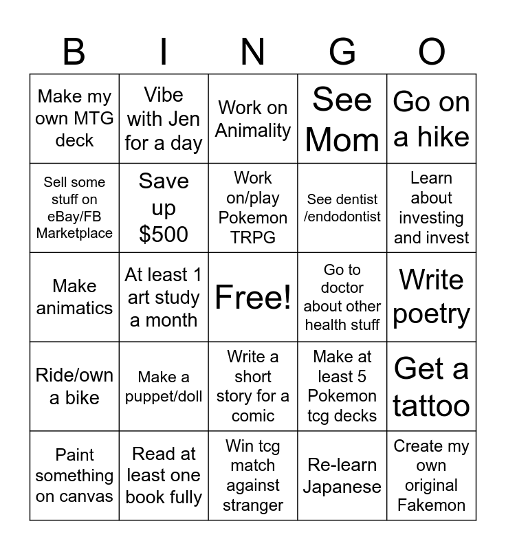 This bingo card has a free space and 24 words: Make a puppet/doll, Read at least one book fully, Work on/play Pokemon TRPG, Paint something on canvas, Go on a hike, Make my own MTG deck, Sell some stuff on eBay/FB Marketplace, Vibe with Jen for a day, Go to doctor about other health stuff, Write a short story for a comic, See dentist /endodontist, Make animatics, Make at least 5 Pokemon tcg decks, Get a tattoo, Save up $500, Re-learn Japanese, Write poetry, Work on Animality, Learn about investing and invest, At least 1 art study a month, Create my own original Fakemon, Ride/own a bike, See Mom and Win tcg match against stranger.