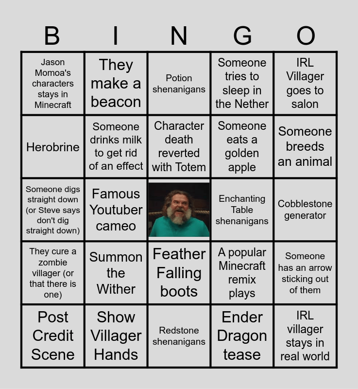 This bingo card has a free space and 24 words: Summon the Wither, Show Villager Hands, Character death reverted with Totem, Post Credit Scene, IRL Villager goes to salon, Jason Momoa's characters stays in Minecraft, Herobrine, They make a beacon, Enchanting Table shenanigans, Feather Falling boots, Someone eats a golden apple, Someone digs straight down (or Steve says don't dig straight down), A popular Minecraft remix plays, Someone has an arrow sticking out of them, Someone drinks milk to get rid of an effect, Ender Dragon tease, Cobblestone generator, Potion shenanigans, Someone breeds an animal, Famous Youtuber cameo, IRL villager stays in real world, They cure a zombie villager (or that there is one), Someone tries to sleep in the Nether and Redstone shenanigans.