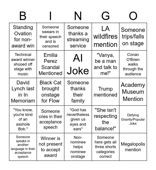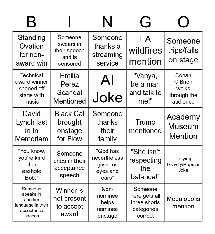 This bingo card has a free space and 24 words: Someone cries in their acceptance speech, Winner is not present to accept award, AI Joke, Someone speaks in another language in their acceptance speech, Someone trips/falls on stage, Standing Ovation for non-award win, Technical award winner shooed off stage with music, Someone swears in their speech and is censored, Trump mentioned, "God has nevertheless given us eyes and ears", "Vanya, be a man and talk to me!", David Lynch last in In Memoriam, "She isn't respecting the balance!", Defying Gravity/Popular Joke, Emilia Perez Scandal Mentioned, Someone here gets all three shorts categories correct, Academy Museum Mention, Someone thanks a streaming service, Conan O'Brien walks through the audience, Black Cat brought onstage for Flow, Megalopolis mention, "You know, you're kind of an asshole Bob.", LA wildfires mention and Non-nominee helps nominee onstage.