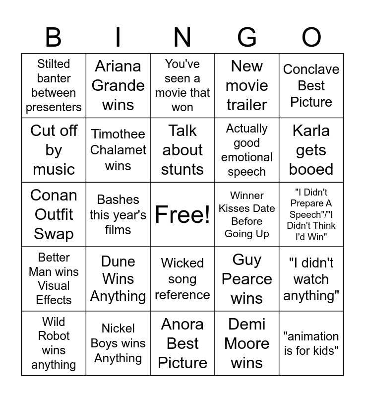This bingo card has a free space and 49 words: Horrible dress/outfit, "animation is for kids", Musical Performance, Anora Best Picture, Dune Wins Anything, Goes longer than 3 1/2 hours, Ariana Grande wins, Mention of teleprompter messing up, Cut off by music, A WTF win, Timothee Chalamet wins, New movie trailer, "I didn't watch anything", Guy Pearce wins, First Time Acting Winner, Emilia Perez Wins Anything, Talk about stunts, Winner Kisses Date Before Going Up, I'm Still Here Wins Anything, Conclave Best Picture, Bashes this year's films, Demi Moore wins, Stilted banter between presenters, Actually good emotional speech, Presenter steals the show, Karla gets booed, Wild Robot wins anything, Conan pulls a lever, Wicked song reference, Better Man wins Visual Effects, I Am Ready, Warden wins Documentary Short, Yuck Wins Animated Short, A Lien Wins Short, Sugarcane wins Documentary, Nickel Boys wins Anything, Substance wins Hair/Makeup, Emilia Perez crew/cast speaks Spanish or French, Translator, "I Didn't Prepare A Speech"/"I Didn't Think I'd Win", Conan In The Audience, Someone Trips, Standing Ovation, Winner Not Present, Disappointed Nominee, Conan Outfit Swap, You've seen a movie that won, 5+ People On Stage to Accept Award, LA wildfires mentioned and Political Reference.