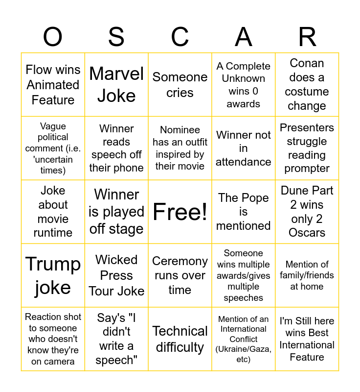 This bingo card has a free space and 39 words: Demi Moore wins Best Actress, California Wildfires mentioned, Joke about a movie that isn't nominated, Winner reads speech off their phone, Reaction shot to someone who doesn't know they're on camera, Ceremony runs over time, Nominee has an outfit inspired by their movie, Best Picture & Best Director go to different movies, Conan does a costume change, Trump joke, Winner is played off stage, A Complete Unknown wins 0 awards, I'm Still here wins Best International Feature, Dune Part 2 wins only 2 Oscars, The Pope is mentioned, Wicked Press Tour Joke, "Respect the Balance" or Ozempic joke, Flow wins Animated Feature, Emilia Perez wins 3 Oscars, Someone wins multiple awards/gives multiple speeches, Vague political comment (i.e. 'uncertain times), Technical difficulty, Winner not in attendance, Presenters struggle reading prompter, Taylor Swift mention, Elon Musk Joke, Actress trips on gown, First time Winner, Winner swears, Marvel Joke, Awkward winner announcement, Conan sings, Someone cries, Say's "I didn't write a speech", Mention of an International Conflict (Ukraine/Gaza, etc), Winner doesn't know where to go after Speech, Mention of family/friends at home, Joke about movie runtime and Huge award upset/surprise.