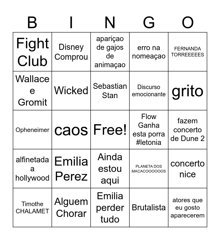 This bingo card has a free space and 24 words: Emilia Perez, Alguem Chorar, Sebastian Stan, Timothe CHALAMET, FERNANDA TORREEEEES, Fight Club, Wallace e Gromit, Disney Comprou, Flow Ganha esta porra #letonia, Ainda estou aqui, Discurso emocionante, Opheneimer, PLANETA DOS MACACOOOOOOS, concerto nice, Wicked, Brutalista, fazem concerto de Dune 2, apariçao de gajos de animaçao, grito, caos, atores que eu gosto aparecerem, alfinetada a hollywood, erro na nomeaçao and Emilia perder tudo.