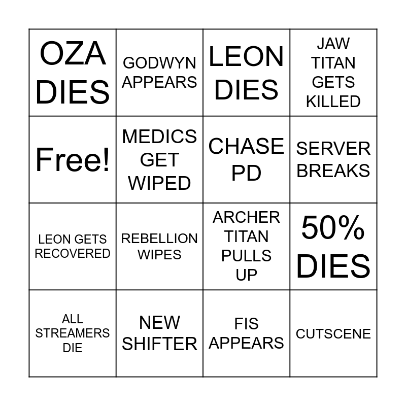 This bingo card has 16 words: NEW SHIFTER, 50% DIES, LEON DIES, OZA DIES, LEON GETS RECOVERED, GODWYN APPEARS, ARCHER TITAN PULLS UP, FIS APPEARS, Free!, MEDICS GET WIPED, ALL STREAMERS DIE, JAW TITAN GETS KILLED, REBELLION WIPES, SERVER BREAKS, CHASE PD and CUTSCENE.