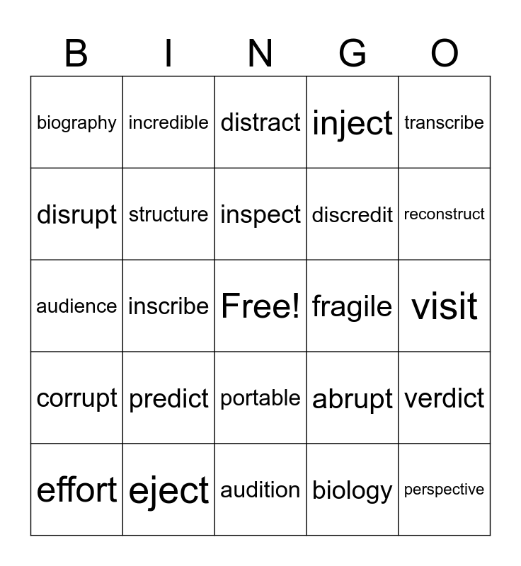 This bingo card has a free space and 24 words: predict, eject, inspect, effort, transcribe, biography, disrupt, incredible, fragile, portable, discredit, audience, abrupt, verdict, structure, biology, visit, distract, reconstruct, inscribe, perspective, corrupt, inject and audition.