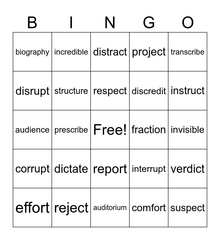 This bingo card has a free space and 24 words: dictate, reject, respect, effort, transcribe, biography, disrupt, incredible, fraction, report, discredit, audience, interrupt, verdict, structure, comfort, invisible, distract, instruct, prescribe, suspect, corrupt, project and auditorium.