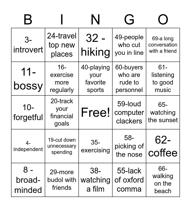 This bingo card has a free space and 24 words: 8 - broad-minded, 19-cut down unnecessary spending, 40-playing your favorite sports, 55-lack of oxford comma, 69-a long conversation with a friend, 3- introvert, 24-travel top new places, 32 - hiking, 59-loud computer clackers, 65-watching the sunset, 10-forgetful, 16- exercise more regularly, 58-picking of the nose, 62-coffee, 11- bossy, 29-more budol with friends, 38-watching a film, 49-people who cut you in line, 61-listening to good music, 4-independent, 20-track your financial goals, 35-exercising, 60-buyers who are rude to personnel and 66-walking on the beach.