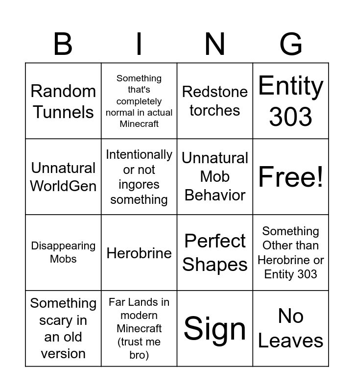 This bingo card has 18 words: Herobrine, No Leaves, Redstone torches, Random Tunnels, Perfect Shapes, Entity 303, Something scary in an old version, Something that's completely normal in actual Minecraft, Free!, Disappearing Mobs, Sign, Unnatural WorldGen, Something Other than Herobrine or Entity 303, Intentionally or not ingores something, Unnatural Mob Behavior, Blocks change to a different block, Far Lands in modern Minecraft (trust me bro) and Seed Worldgen is completely different in video.