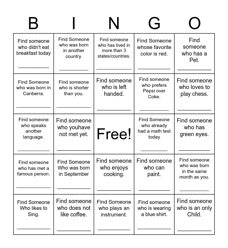 This bingo card has a free space and 25 words: Find Someone Who was born in September ____________, Find Someone who plays an instrument. ___________, Find someone who is left handed. ___________, Find Someone Who likes to Sing. ____________, Find someone who has a Pet. ___________, Find someone who didn't eat breakfast today ___________, Find Someone who was born in Canberra. _____________, Find Someone who was born in another country. ___________, Find Someone who already had a math test today __________, Find someone who enjoys cooking. ___________, Find someone who prefers Pepsi over Coke. ___________, Find someone who speaks another language. ____________, Find someone who can paint. __________, Find someone who was born in the same month as you. ___________, Find someone who is shorter than you. _____________, Find someone who has been on a cruise. ___________, Find someone who has green eyes. __________, Find someone who has lived in more than 3 states/countries. ______________, Find someone who loves to play chess. ___________, Find someone who youhave not met yet. ___________, Find someone who is an only Child. ___________, Find someone who does not like coffee. ___________, Find someone who has met a famous person. _____________, Find Someone whose favorite color is red. ___________ and Find someone who is wearing a blue shirt. ____________.