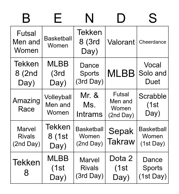 This bingo card has a free space and 72 words: Basketball Men, Basketball Women, Volleyball Men and Women, Table Tennis Men and Women, Chess Men and Women, Scrabble, Valorant, Marvel Rivals, MLBB, Dota 2, Tekken 8, CODM, Vocal Solo and Duet, Futsal Men and Women, Dance Sports, Amazing Race, Sepak Takraw, Cheerdance, Basketball Men (1st Day), Scrabble (1st Day), Tekken 8 (1st Day), Dance Sports (1st Day), Basketball Women (1st Day), Valorant (1st Day), CODM (1st Day), Amazing Race (1st Day), Sepak Takraw (1st Day), Marvel Rivals (1st Day), Volleyball Men and Women (1st Day), Table Tennis Men and Women (1st Day), MLBB (1st Day), Vocal Solo and Duet (1st Day), Cheerdance (1st Day), Chess Men and Women (1st Day), Dota 2 (1st Day), Futsal Men and Women (1st Day), Basketball Men (2nd Day), Scrabble (2nd Day), Tekken 8 (2nd Day), Dance Sports (2nd Day), Basketball Women (2nd Day), Valorant (2nd Day), CODM (2nd Day), Amazing Race (2nd Day), Sepak Takraw (2nd Day), Marvel Rivals (2nd Day), Volleyball Men and Women (2nd Day), Table Tennis Men and Women (2nd Day), MLBB (2nd Day), Vocal Solo and Duet (2nd Day), Cheerdance (2nd Day), Chess Men and Women (2nd Day), Dota 2 (2nd Day), Futsal Men and Women (2nd Day), Basketball Men (3rd Day), Scrabble (3rd Day), Tekken 8 (3rd Day), Dance Sports (3rd Day), Basketball Women (3rd Day), Valorant (3rd Day), CODM (3rd Day), Amazing Race (3rd Day), Sepak Takraw (3rd Day), Marvel Rivals (3rd Day), Volleyball Men and Women (3rd Day), Table Tennis Men and Women (3rd Day), MLBB (3rd Day), Vocal Solo and Duet (3rd Day), Cheerdance (3rd Day), Chess Men and Women (3rd Day), Dota 2 (3rd Day) and Futsal Men and Women (3rd Day).