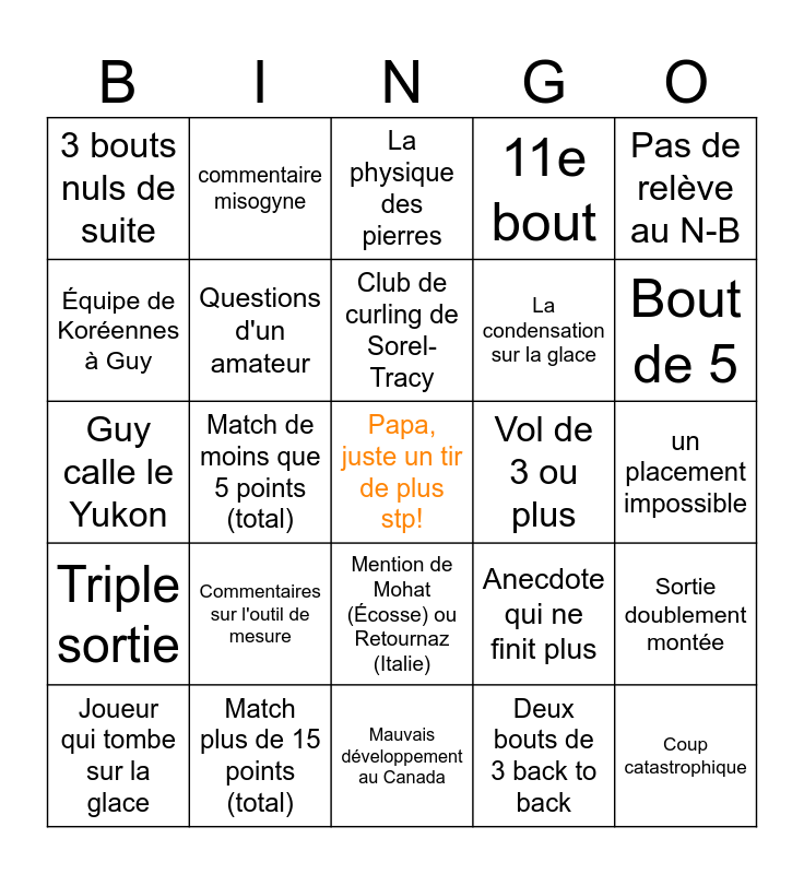 This bingo card has a free space and 24 words: Commentaires sur l'outil de mesure, Match plus de 15 points (total), Club de curling de Sorel-Tracy, Joueur qui tombe sur la glace, Pas de relève au N-B, 3 bouts nuls de suite, Équipe de Koréennes à Guy, commentaire misogyne, Vol de 3 ou plus, Mention de Mohat (Écosse) ou Retournaz (Italie), La condensation sur la glace, Guy calle le Yukon, Anecdote qui ne finit plus, Sortie doublement montée, Questions d'un amateur, Deux bouts de 3 back to back, un placement impossible, La physique des pierres, Bout de 5, Match de moins que 5 points (total), Coup catastrophique, Triple sortie, 11e bout and Mauvais développement au Canada.