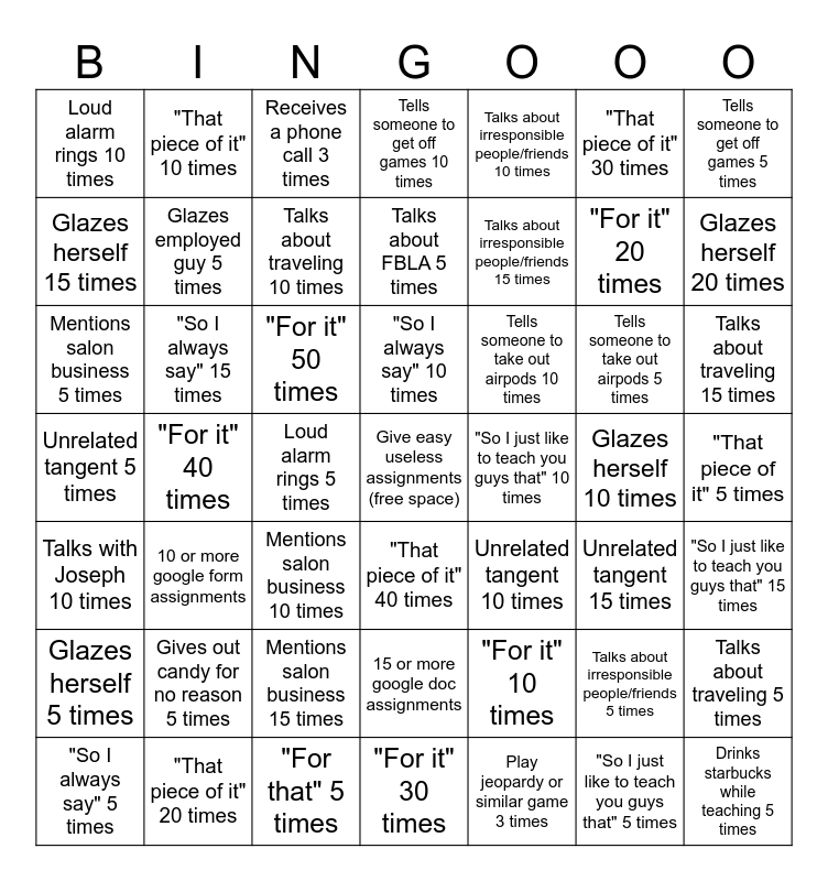 This bingo card has a free space and 48 words: "For it" 10 times, "For it" 20 times, "For it" 30 times, "For it" 40 times, "For it" 50 times, "That piece of it" 5 times, "That piece of it" 10 times, "That piece of it" 20 times, "That piece of it" 30 times, "That piece of it" 40 times, Tells someone to get off games 5 times, Tells someone to get off games 10 times, Tells someone to take out airpods 5 times, Tells someone to take out airpods 10 times, Glazes herself 5 times, Glazes herself 10 times, Glazes herself 15 times, Glazes herself 20 times, Talks about irresponsible people/friends 5 times, Talks about irresponsible people/friends 10 times, Talks about irresponsible people/friends 15 times, Loud alarm rings 5 times, Loud alarm rings 10 times, Glazes employed guy 5 times, Talks about traveling 5 times, Talks about traveling 10 times, Talks about traveling 15 times, "So I always say" 5 times, "So I always say" 10 times, "So I always say" 15 times, "So I just like to teach you guys that" 5 times, "So I just like to teach you guys that" 10 times, "So I just like to teach you guys that" 15 times, Gives out candy for no reason 5 times, Unrelated tangent 5 times, Unrelated tangent 10 times, Unrelated tangent 15 times, Mentions salon business 5 times, Mentions salon business 10 times, Mentions salon business 15 times, Talks with Joseph 10 times, Drinks starbucks while teaching 5 times, Receives a phone call 3 times, "For that" 5 times, Talks about FBLA 5 times, 15 or more google doc assignments, 10 or more google form assignments and Play jeopardy or similar game 3 times.