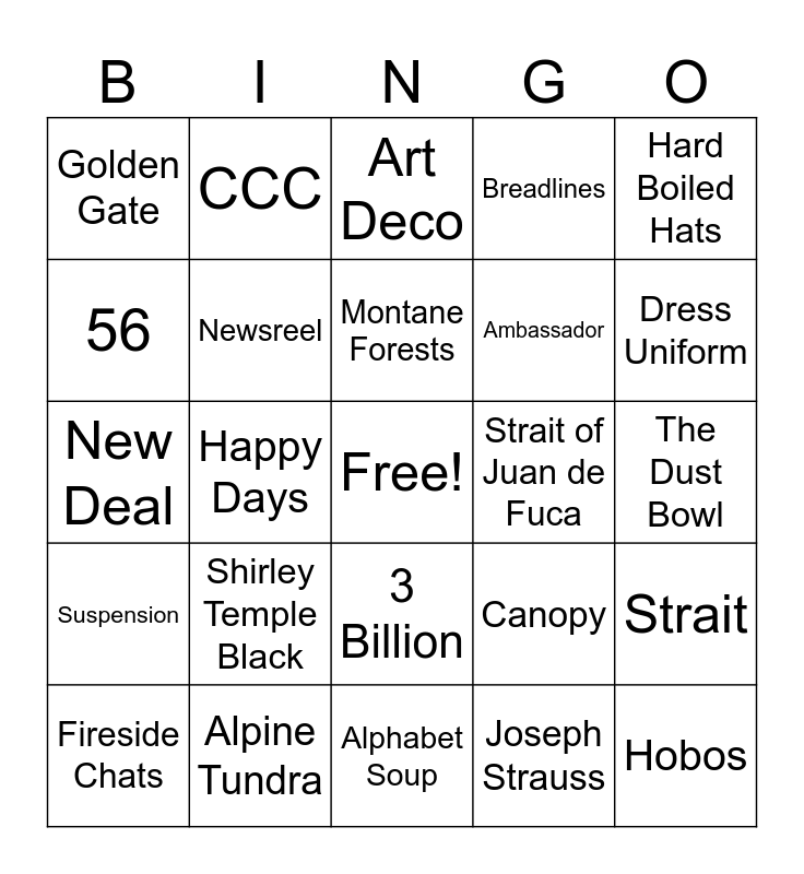 This bingo card has a free space and 29 words: Fireside Chats, WPA, Happy Days, Roosevels’s Tree Army, Golden Gate, Art Deco, Newsreel, Shirley Temple Black, Strait of Juan de Fuca, Alpine Tundra, The Dust Bowl, Hobos, Alphabet Soup, Joseph Strauss, Dress Uniform, 48, 3 Billion, Suspension, Hard Boiled Hats, New Deal, Canopy, Nurse Logs, Ambassador, 56, Breadlines, CCC, Strait, Montane Forests and Subalpine Forests.