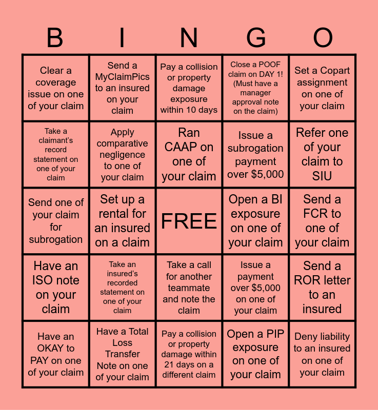 This bingo card has a free space and 24 words: Take an insured’s recorded statement on one of your claim, Have a Total Loss Transfer Note on one of your claim, Ran CAAP on one of your claim, Have an OKAY to PAY on one of your claim, Set a Copart assignment on one of your claim, Clear a coverage issue on one of your claim, Take a claimant’s record statement on one of your claim, Send a MyClaimPics to an insured on your claim, Open a BI exposure on one of your claim, Take a call for another teammate and note the claim, Issue a subrogation payment over $5,000, Send one of your claim for subrogation, Issue a payment over $5,000 on one of your claim, Send a ROR letter to an insured, Apply comparative negligence to one of your claim, Open a PIP exposure on one of your claim, Send a FCR to one of your claim, Pay a collision or property damage exposure within 10 days, Refer one of your claim to SIU, Set up a rental for an insured on a claim, Deny liability to an insured on one of your claim, Have an ISO note on your claim, Close a POOF claim on DAY 1! (Must have a manager approval note on the claim) and Pay a collision or property damage within 21 days on a different claim.