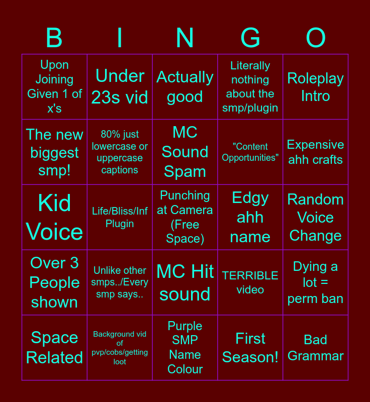 This bingo card has a free space and 24 words: Unlike other smps../Every smp says.., Background vid of pvp/cobs/getting loot, MC Sound Spam, Space Related, Roleplay Intro, Upon Joining Given 1 of x's, The new biggest smp!, Under 23s vid, Edgy ahh name, MC Hit sound, "Content Opportunities", Kid Voice, TERRIBLE video, Dying a lot = perm ban, 80% just lowercase or uppercase captions, First Season!, Random Voice Change, Actually good, Expensive ahh crafts, Life/Bliss/Inf Plugin, Bad Grammar, Over 3 People shown, Literally nothing about the smp/plugin and Purple SMP Name Colour.