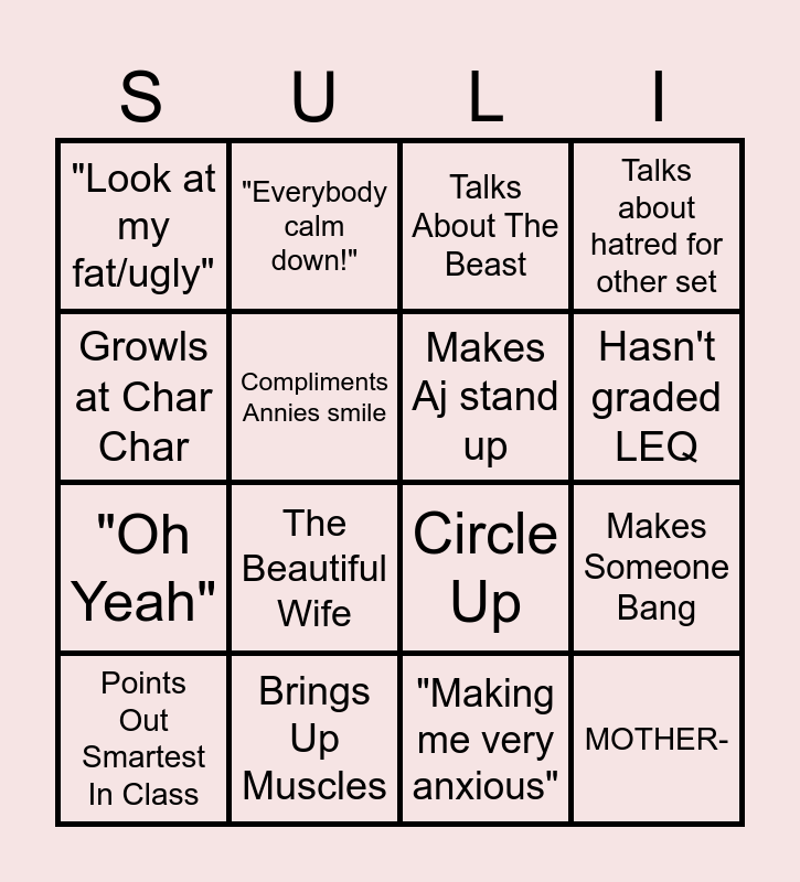 This bingo card has 25 words: Belly reveal, "I'm gonna bludgeon you", Hasn't graded LEQ, Says we're on pace, Growls at Char Char, "Look at my fat/ugly", Compliments Annies smile, "Everybody calm down!", Brings Up Muscles, Brings up family member, "Oh Yeah", Circle Up, Throws Something, Brings up Beckett ex girlfriends, Makes Aj stand up, Obvious Mispronunciation, "Making me very anxious", Talks About The Beast, The Beautiful Wife, Makes Someone Bang, Points Out Smartest In Class, Mentions Aj Concussion, MOTHER-, Talks about hatred for other set and Argues politically with Jack.