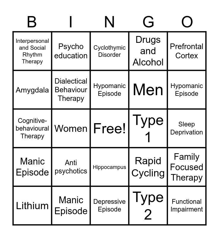 This bingo card has a free space and 24 words: Anti psychotics, Manic Episode, Hypomanic Episode, Lithium, Prefrontal Cortex, Interpersonal and Social Rhythm Therapy, Amygdala, Psycho education, Type 1, Hippocampus, Men, Cognitive-behavioural Therapy, Rapid Cycling, Family Focused Therapy, Dialectical Behaviour Therapy, Type 2, Sleep Deprivation, Cyclothymic Disorder, Hypomanic Episode, Women, Functional Impairment, Manic Episode, Drugs and Alcohol and Depressive Episode.
