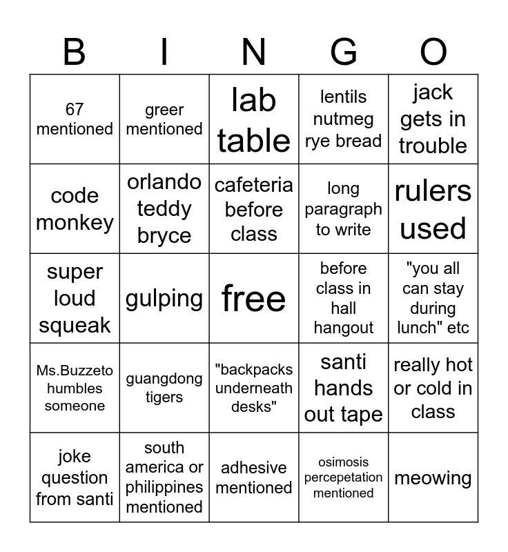 This bingo card has a free space and 24 words: guangdong tigers, south america or philippines mentioned, cafeteria before class, joke question from santi, jack gets in trouble, 67 mentioned, code monkey, greer mentioned, before class in hall hangout, "backpacks underneath desks", long paragraph to write, super loud squeak, santi hands out tape, really hot or cold in class, orlando teddy bryce, osimosis percepetation mentioned, "you all can stay during lunch" etc, lab table, rulers used, gulping, meowing, Ms.Buzzeto humbles someone, lentils nutmeg rye bread and adhesive mentioned.