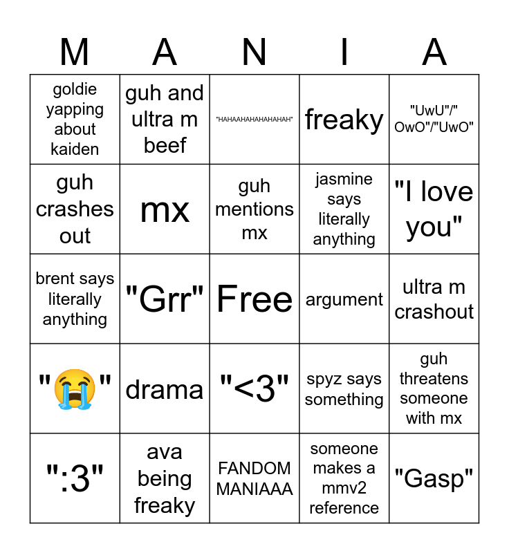 This bingo card has a free space and 24 words: drama, ava being freaky, guh mentions mx, ":3", "UwU"/" OwO"/"UwO", goldie yapping about kaiden, guh crashes out, guh and ultra m beef, argument, "<3", jasmine says literally anything, brent says literally anything, spyz says something, guh threatens someone with mx, mx, someone makes a mmv2 reference, ultra m crashout, "HAHAAHAHAHAHAHAH", "I love you", "Grr", "Gasp", "😭", freaky and FANDOM MANIAAA.