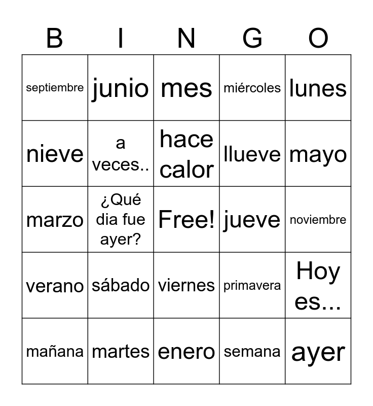 This bingo card has a free space and 45 words: día, ayer, hoy, mañana, fecha, semana, mes, estación, lunes, martes, miércoles, jueve, viernes, sábado, domingo, enero, febrero, marzo, abril, mayo, junio, julio, agosto, septiembre, octubre, noviembre, diciembre, invierno, primavera, verano, otoño, Hoy es..., Mañana sera..., ayer fue..., ¿Qué día es hoy?, ¿Qué dia fue ayer?, Ayer fue..., ¿Cuál es la fecha de hoy?, hace frío, hace calor, nieve, llueve, hace sol, a veces.. and mucho.
