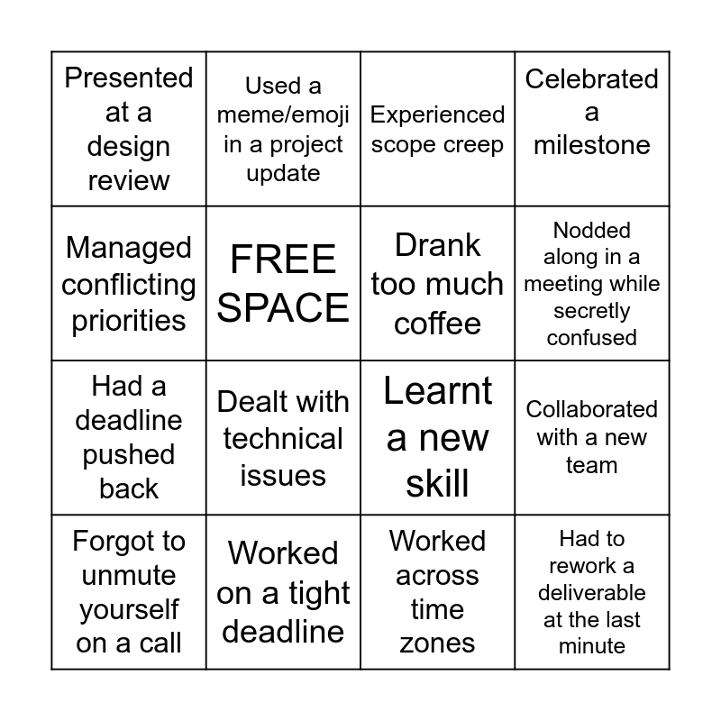 This bingo card has 16 words: Worked on a tight deadline, Collaborated with a new team, Experienced scope creep, Presented at a design review, Had a deadline pushed back, Used a meme/emoji in a project update, Learnt a new skill, Worked across time zones, Managed conflicting priorities, FREE SPACE, Forgot to unmute yourself on a call, Celebrated a milestone, Dealt with technical issues, Nodded along in a meeting while secretly confused, Drank too much coffee and Had to rework a deliverable at the last minute.