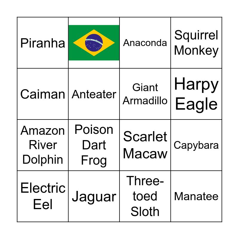 This bingo card has 1 images and 15 words: Jaguar, Capybara, Anaconda, Piranha, Amazon River Dolphin, Scarlet Macaw, Three-toed Sloth, Caiman, Anteater, Electric Eel, Squirrel Monkey, Poison Dart Frog, Harpy Eagle, Giant Armadillo and Manatee.