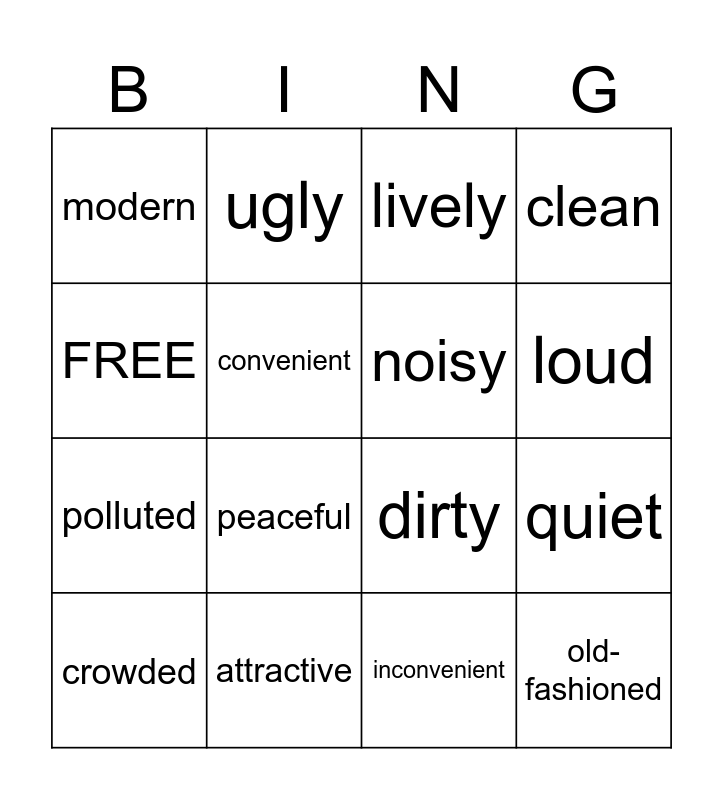 This bingo card has 16 words: attractive, quiet, lively, modern, polluted, ugly, dirty, inconvenient, FREE, convenient, crowded, clean, peaceful, loud, noisy and old-fashioned.