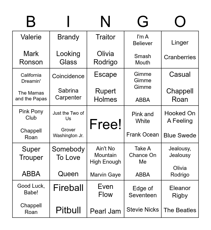 This bingo card has a free space and 68 words: Let It Be The Beatles, Eleanor Rigby The Beatles, All You Need Is Love The Beatles, Hey Jude The Beatles, Lucy In The Sky With Diamonds The Beatles, Yesterday The Beatles, Brandy Looking Glass, Fooled Around & Fell In Love Elvin Bishop, Escape Rupert Holmes, Come A Little Bit Closer Jay + The Americans, Ain't No Mountain High Enough Marvin Gaye, No Sleep Till Brooklyn Beastie Boys, Hooked On A Feeling Blue Swede, Linger Cranberries, Maneater Hall & Oates, California Dreamin' The Mamas and the Papas, Just the Two of Us Grover Washington Jr., Valerie Mark Ronson, Daughter Pearl Jam, Somebody To Love Queen, Gimme Gimme Gimme ABBA, Take A Chance On Me ABBA, Super Trouper ABBA, Tainted Love Soft Cell, Come On Eileen Dexy's Midnight Runners, Happy Together Turtles, Snow On The Beach Taylor Swift, Mean Taylor Swift, Jealousy, Jealousy Olivia Rodrigo, Deja Vu Olivia Rodrigo, Traitor Olivia Rodrigo, Lacy Olivia Rodrigo, Get Him Back Olivia Rodrigo, Teenage Dream Olivia Rodrigo, I'm A Believer Smash Mouth, Home Edward Sharpe, Too Sweet Hozier, Good Luck, Babe! Chappell Roan, Casual Chappell Roan, Pink Pony Club Chappell Roan, Espresso Sabrina Carpenter, Good Graces Sabrina Carpenter, Coincidence Sabrina Carpenter, Juno Sabrina Carpenter, Don't Smile Sabrina Carpenter, Falling Behind Laufey, I Love You, I’m Sorry Gracie Abrams, That's So True Gracie Abrams, Pink and White Frank Ocean, Fireball Pitbull, Don't Stop The Party Pitbull, Mr. Blue Sky ELO, Joy To The World Three Dog Night, Even Flow Pearl Jam, Love Is An Open Door Frozen, Honey, I'm Home Shania Twain, Edge of Seventeen Stevie Nicks, Birthday The Beatles, Sweet but Psycho Ava Max, Celebration Kool & the Gang, Feel This Moment Pitbull, Christina Aguilera, Raise Your Glass P!nk, It's My Party Lesley Gore, Jump Around House Of Pain, Mo Money Mo Problems The Notorious B.I.G., Waterfalls TLC, ...Baby One More Time Britney Spears and Leavin' Jesse McCartney.